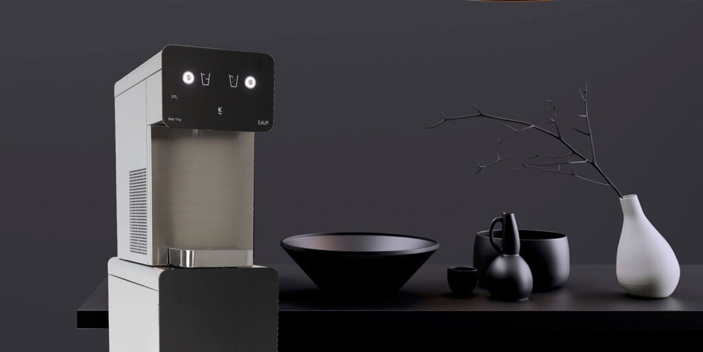 Zu einer Kaffeemaschine ist ein moderner Wasserspender die ideale Ergänzung. Immer frisches Wasser einfach auf Knopfdruck. Ein toller Service für Mitarbeiter, Kunden und Besucher. Der EAU~K One ist wahlweise in weißer oder schwarzer Frontoptik erhältlich. Ein Design so klar wie Wasser.